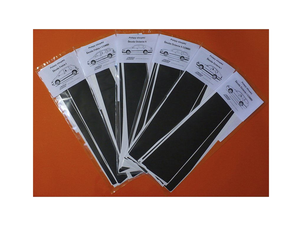 Polepy jsou vyrobeny ze standardní černé lesklé folie. Balení obsahuje polepy středních B sloupků, polepy vnitřních sloupků. Tj. 6 kusů folií